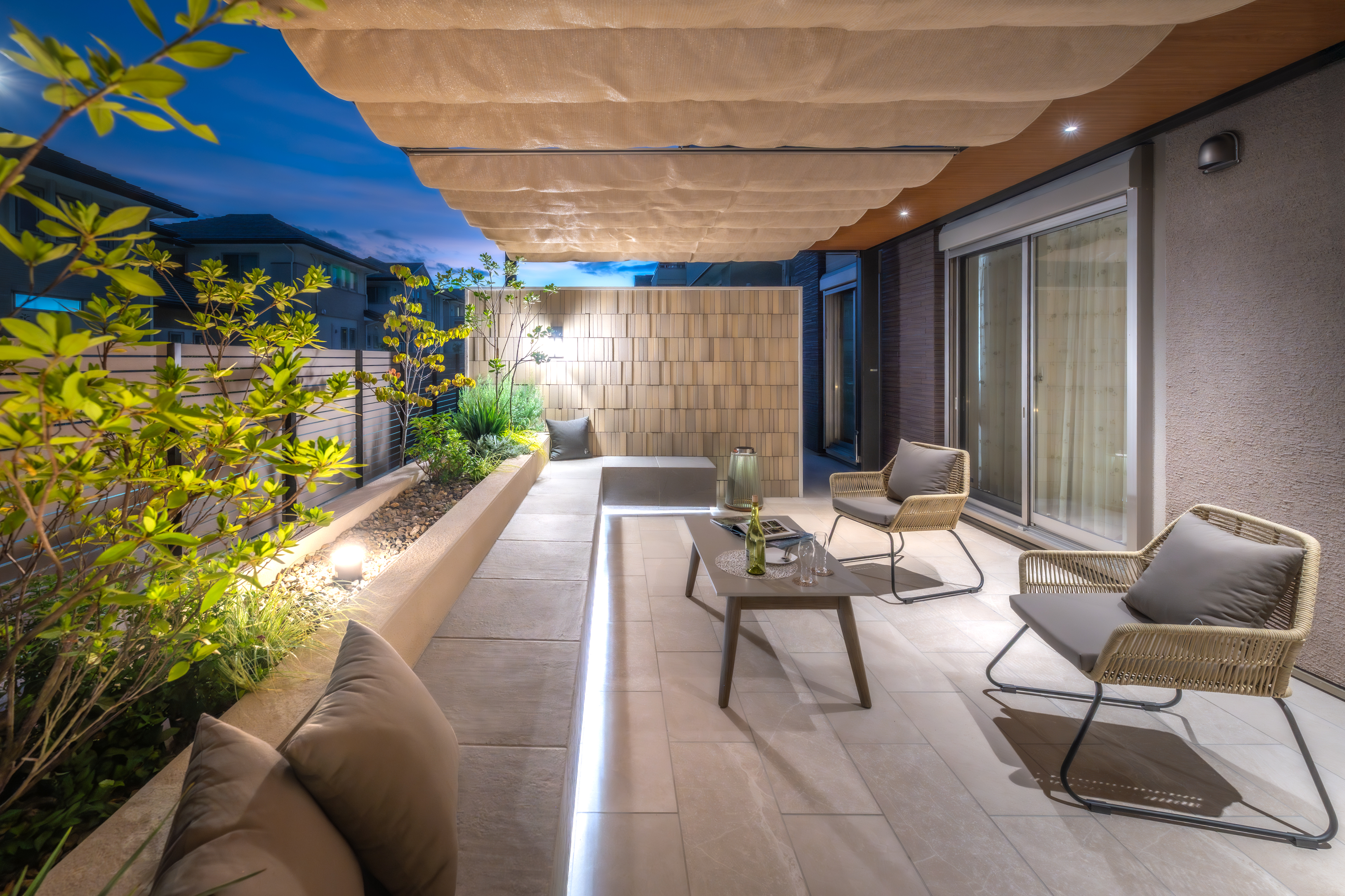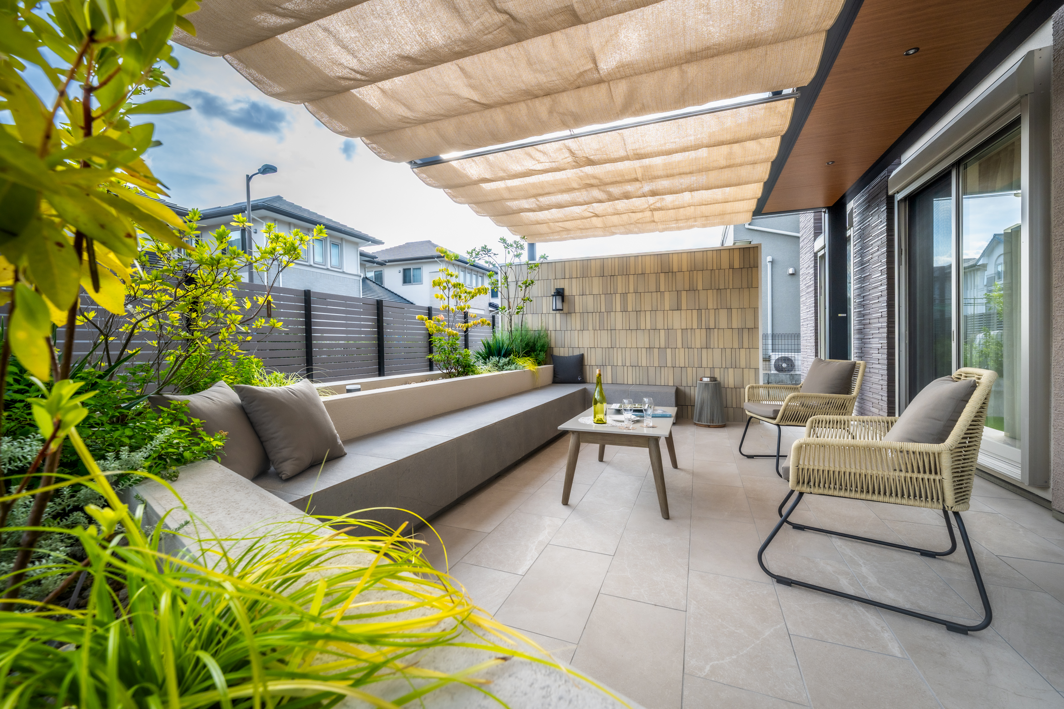 機能的に利用できる広がりを確保しつつ、隣地住居の視線を出来るだけ緩和するため、高さのある壁と開閉可能な電動パーゴラを採用し、屋外にもうひとつのお部屋であるプライベート空間をご提案しました。